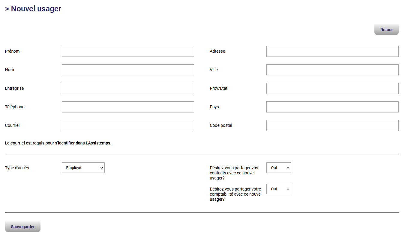 Remplissez ensuite leurs coordonnées, choisissez leur type d'accès (administrateur ou employé) et si vous voulez partager vos contacts ainsi que votre comptabilité avec ce nouvel utilisateur.