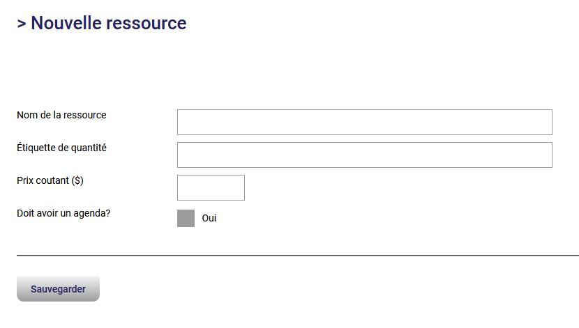 Inscrivez le nom de la ressource, l'étiquette de quantité (par exemple, si la ressource est papier, choisissez feuille) ainsi que son prix courant et déterminez si elle a besoin d'un agenda.