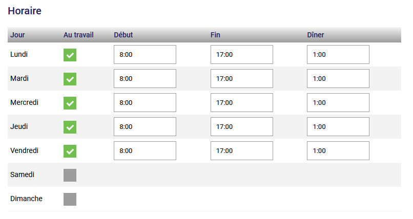 Indiquez le nom de la personne, l'étiquette de quantité (heure, jour, etc), son taux régulier et son taux de temps supplémentaire.  Si vous décidez que la personne ait un agenda, un horaire personnalisable apparaitra à droite après avoir sauvegardé votre page :