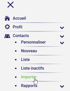 Pour accéder à l'outil pour importer vos contacts, vous devez aller dans Menu - Contacts - Importer: