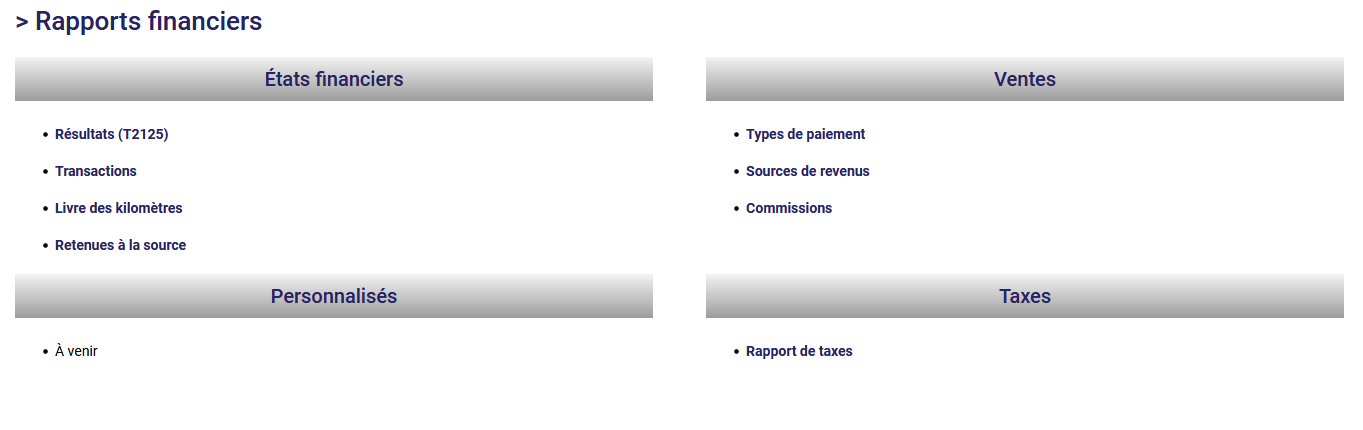 Notez que pour pouvoir extraire vos rapports financiers, vous devez avoir préalablement entré vos ventes, vos dépenses ainsi que toutes autres transactions financières pertinentes.