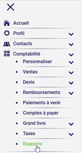 Que vous soyez un travailleur autonome ou une entreprise incorporée, vous trouverez tous les rapports dont vous avez besoin dans L'AssisTemps. Dans les deux cas, les rapports se trouvent sous Menu - Comptabilité - Rapports :